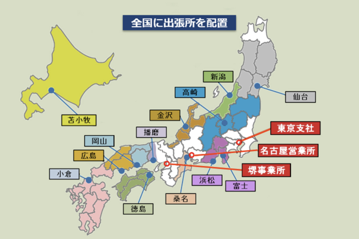 迅速対応徹底のため各営業拠点のほか全国13ヶ所に出張所を構え、