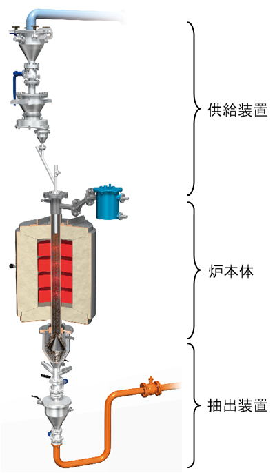 微粉材料を上部から自由落下させることにより、瞬間的に加熱昇温し、発生ガスは上部へ、粉体材料は下部より取り出す焼成設備です。二次電池負極材や正極材などの前処理焼成における品質向上と生産性向上が実現できる画期的なシステムです。 |