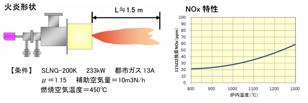| 特長 | ①高速噴流火炎 ・大きな攪拌効果により、炉内温度分布を均一化します。 ②超低NOx ・高速噴流火炎でありながら、炉内拡散燃焼方式により超低NOxを実現しました。 ③予熱空気を有効利用 ・予熱空気温度450℃、13A都市ガス、炉温1300℃の場合、予熱空気温度を活用しない時と比べて燃料を31%節約できます。 ④シンプルな構造 ・小型でシンプルな構造のため、炉体への取り付けやメンテナンスを容易に行うことができます。 ⑤ダイレクト点火方式 ・スパークプラグによるダイレクト点火のため、パイロットバーナ及び配管が不要です。 ⑥幅広い用途に対応 ・熱処理炉から加熱炉まで、幅広い温度域に対応できます。 |