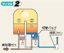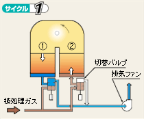 被処理ガスは ● 蓄熱室②を上昇通過し、予熱されます。 ● 高温の燃焼室で十分酸化分解されます。 ● 蓄熱室①を下降し、蓄熱体に吸熱され低温のクリーンガスとして排気されます。 |