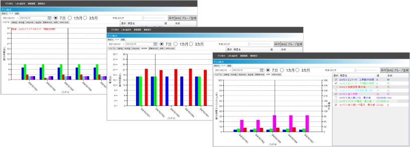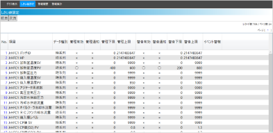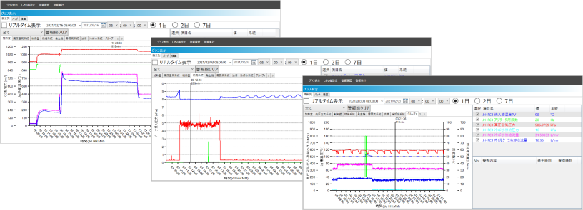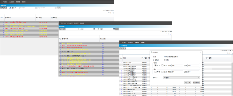 | 便利な“しきい値設定機能” | しきい値管理により予防保全・予知保全をサポート 収集しているすべてのデータに対して、お客様にてしきい値が設定可能。 ![]() ![]() |