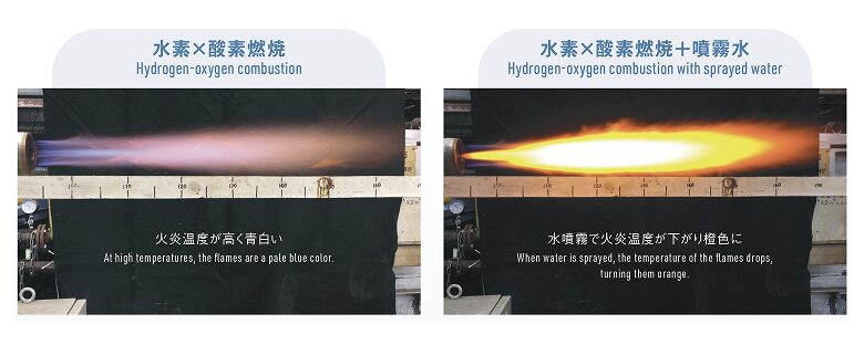 水素×酸素燃焼の火炎の様子・水素燃焼による排ガスに加え、噴霧水を導入することで過熱水蒸気量の調整が可能です。