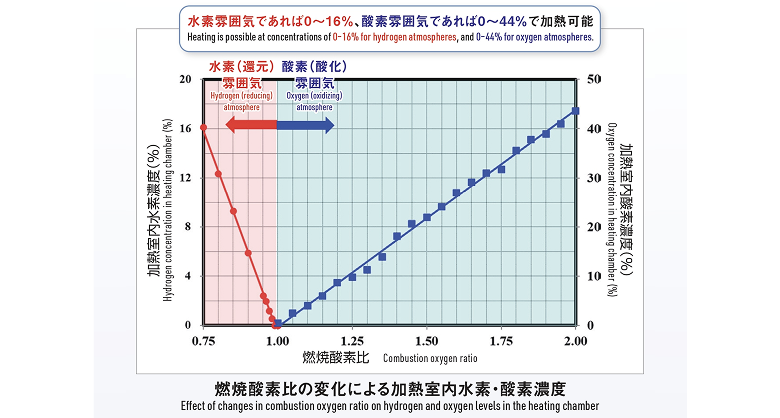 1. 低温200℃~超高温1,700℃の処理が可能・電気加熱の過熱水蒸気発生装置では到達できない超高温での処理を実現。 2. 高い熱伝達特性により短時間で均一に加熱・低温域では過熱水蒸気が水に変わるときの凝縮潜熱により材料加熱を早め、高温域では水蒸気の高い放射伝熱により加熱が可能。 3. 800℃以上で水蒸気による炭素のガス化反応・800℃以上の過熱水蒸気雰囲気で処理材から発生する炭素は水性ガス化反応(※)により、酸化雰囲気においても有機溶剤や樹脂等を自燃させずに分解可能。 4. 酸化雰囲気/無酸化雰囲気どちらの雰囲気でも加熱が可能・水素:酸素の燃焼比率を調整することで、炉内を酸化/無酸化どちらの雰囲気にも調整可能。