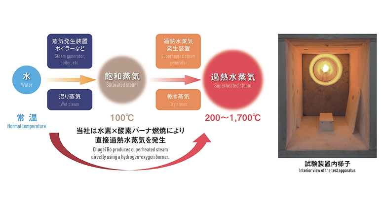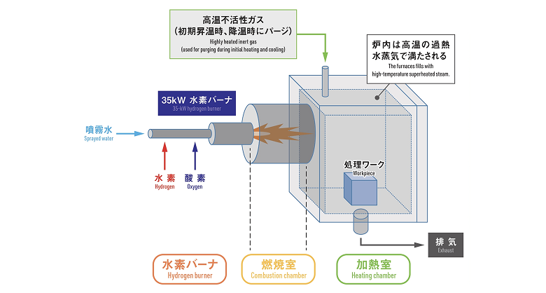 水素と酸素を燃焼させることにより発生する高温過熱水蒸気を加熱源として利用した、CO₂排出ゼロの新しい加熱技術。
